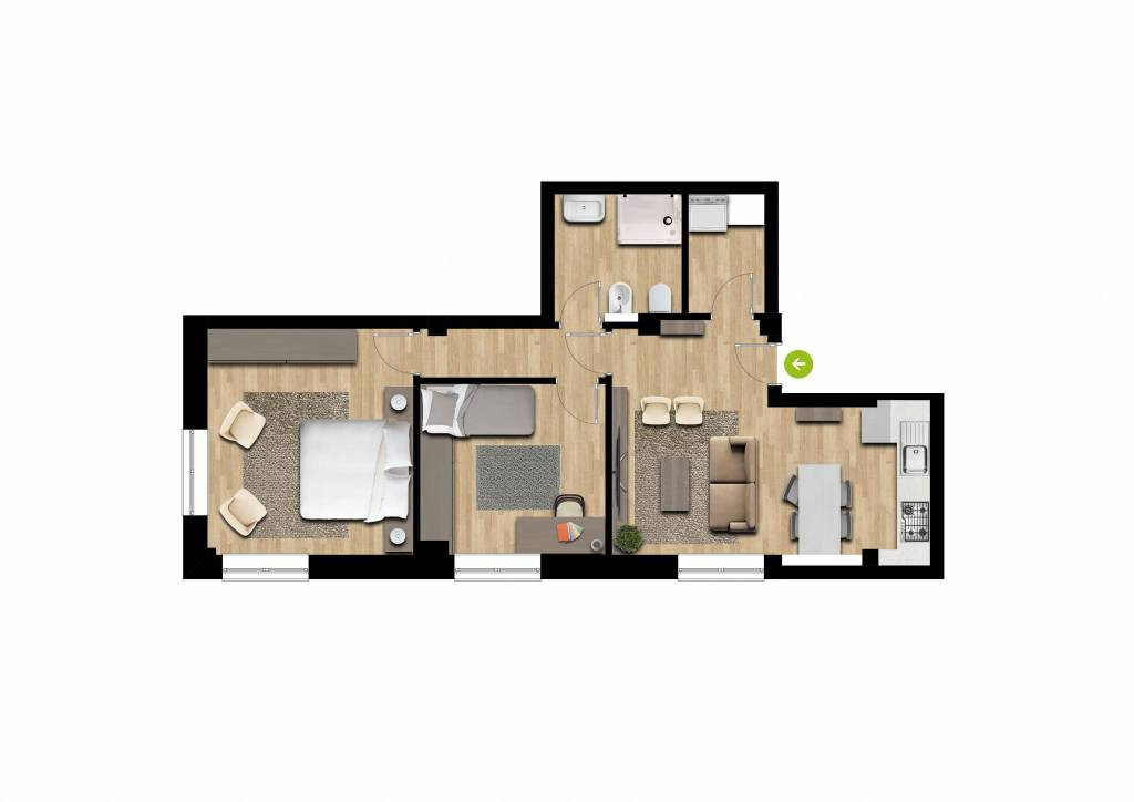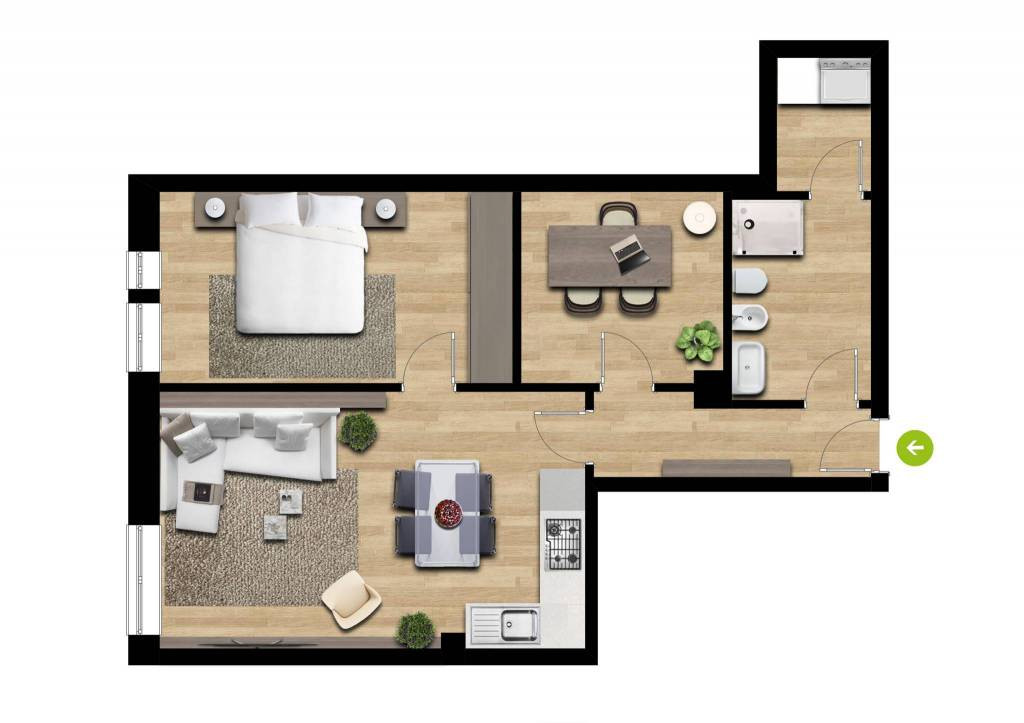 La soluzione è composta da ingresso su corridoio che conduce a una spaziosa zona giorno dotata di angolo cottura,